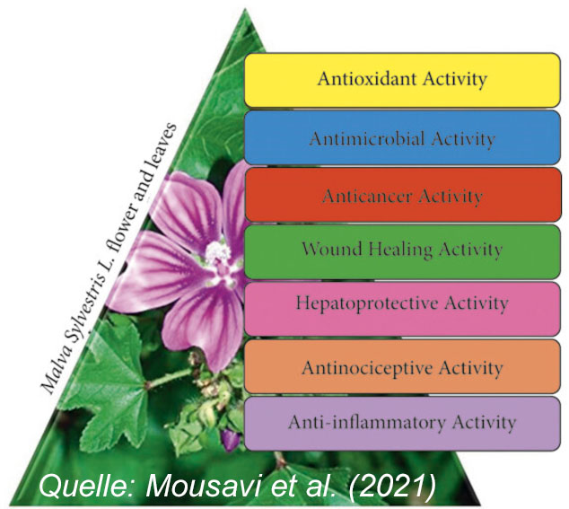 Mousavi, S. M. et al. (2021): A Review on Health Bene!ts of Malva sylvestris L. Nutritional Compounds for Metabolites, Antioxidants, and Anti-Inflammatory, Anticancer, and Antimicrobial Applications – Evidence-Based Complementary and Alternative Medicine, Vol. 2021, Article ID 5548404, 13 Seiten; doi.org/10.1155/2021/5548404.